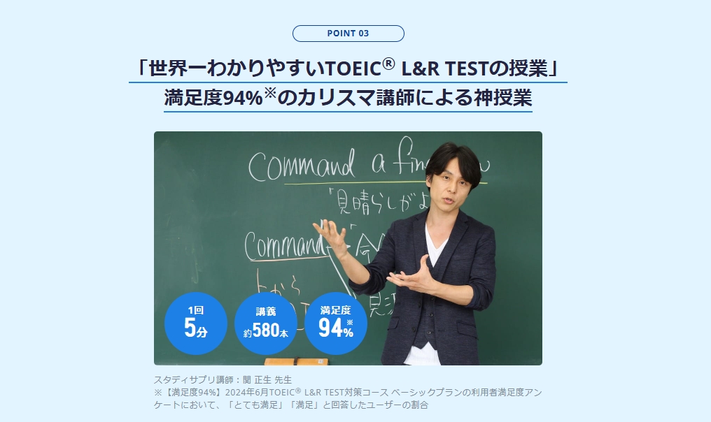 「関先生の授業を聞いて初めて英文法がわかった」という口コミも多く、TOEIC初心者〜中級者に特におすすめです。